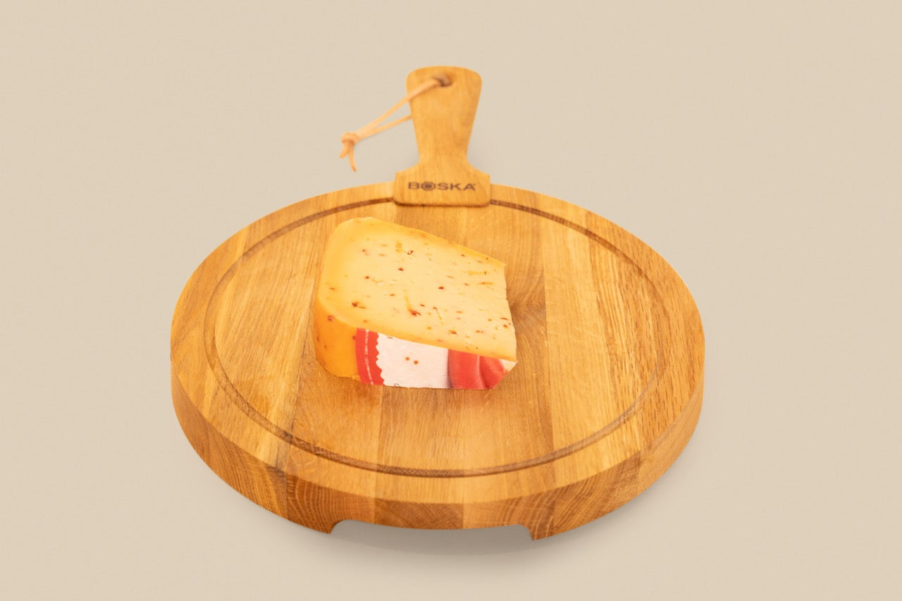 De Pittige Tante is een ambachtelijke, rauwmelkse boerenkaas (48+) met een krachtige, kruidige smaak en een pittige twist. Deze jonge belegen kaas is verrijkt met 0,7% chili, wat zorgt voor een subtiele maar prikkelende hitte die perfect in balans is met de romige structuur.